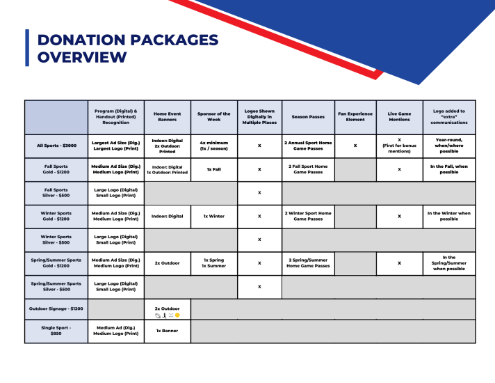 Interested in being a Seasonal Silver sponsor? You can view more details in the Silver Sports Package document.